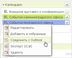 Вы можете синхронизировать с календарями MS Outlook любые календари на Портале: свои персональные, календари сотрудников или общие календари компании. Попробуйте сделать это прямо сейчас! Перейти на страницу с одним из календарей, выбрать из меню действий <Соединить с Outlook> и запустить процесс синхронизации!